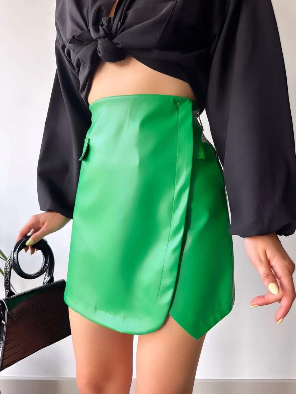 Şıklığı ve rahatlığı bir arada arayan kadınların tercihi olan Cep Detaylı Oval Kapaklı Deri Etek Yeşil, şıklığı seven kadınların gardırobunda mutlaka bulunmalı.