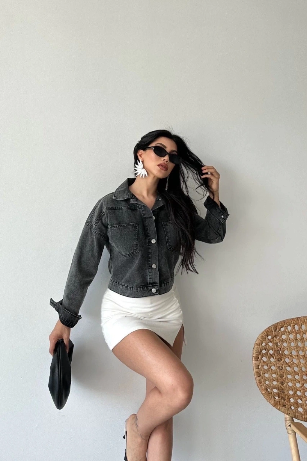 Yeni sezonda sokak modasına yön veren çift cepli kol katlamalı süper taş enzim yıkama crop kot ceket ile tarzınızı ön plana çıkarın.