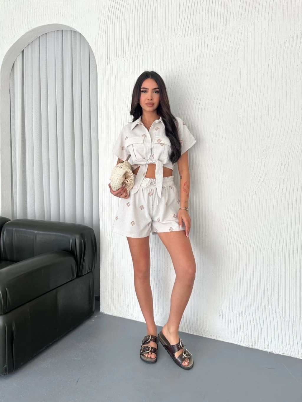 Keten kumaştan üretilen şık bir görünüme sahip gömlek şort takımı ile her zaman şıklığınızı koruyun.