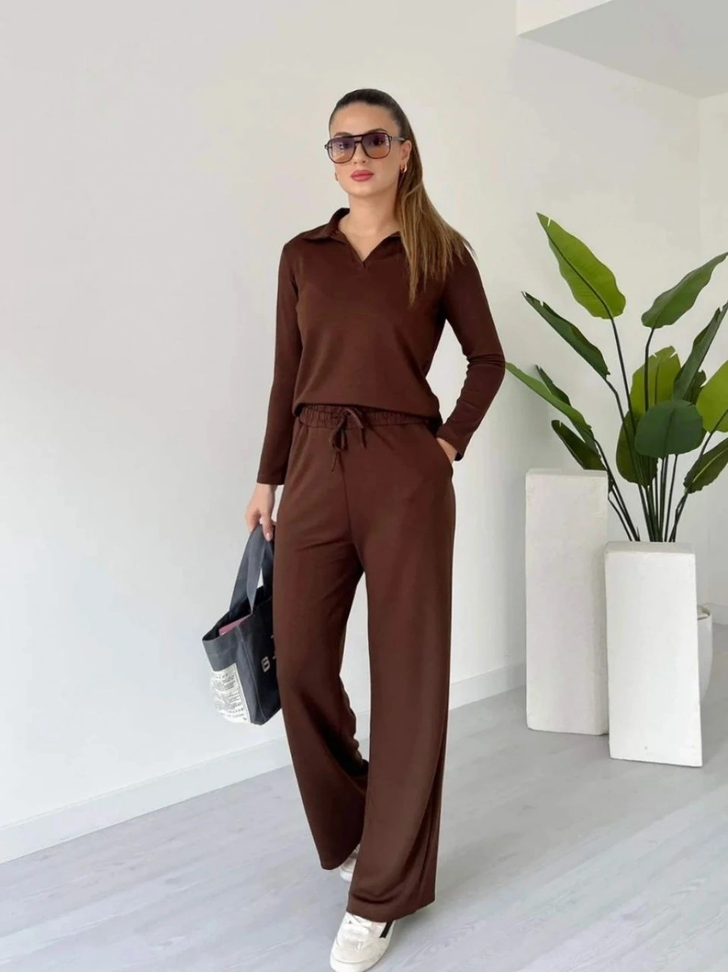 Şıklık ve konforun bir araya geldiği Kadın Polo Yaka Alt Üst Kollu Modal Takım Kahve PT, günlük giyimde ve özel günlerde şıklığınızı tamamlar.