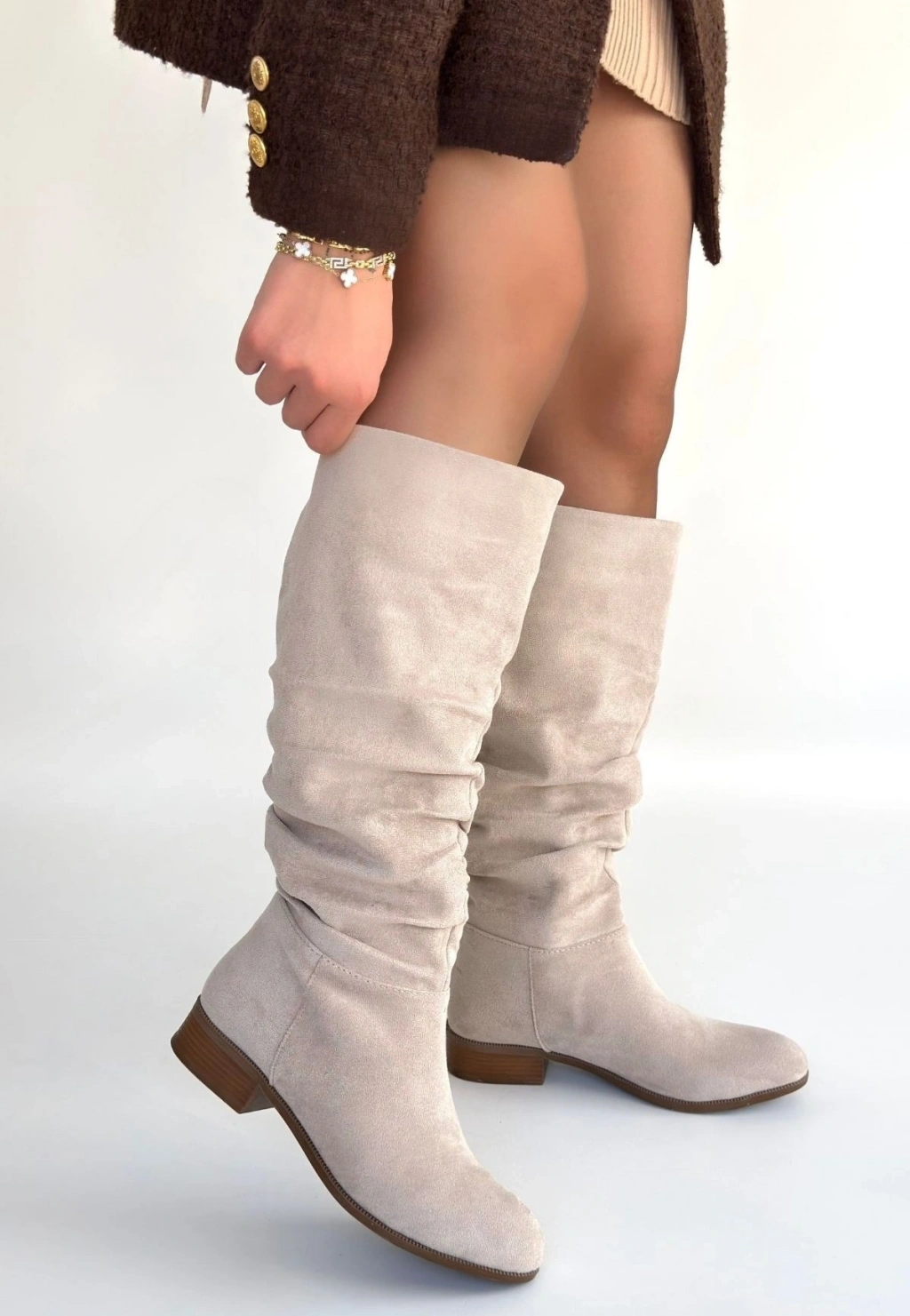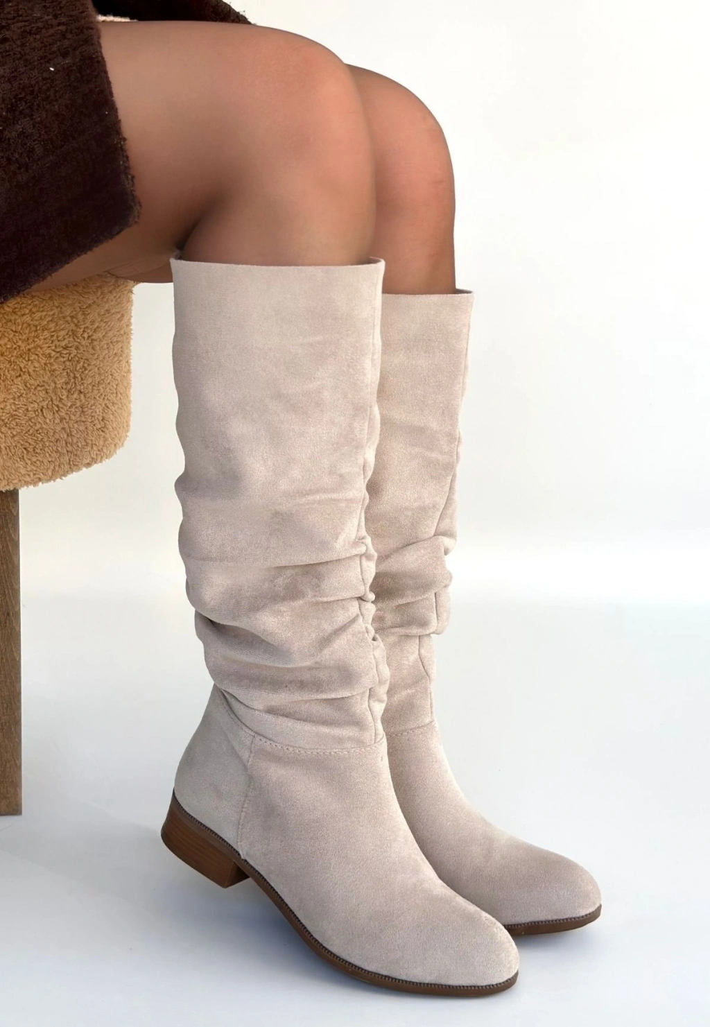 • Winda Bej Süet Körüklü Topuklu Çizme